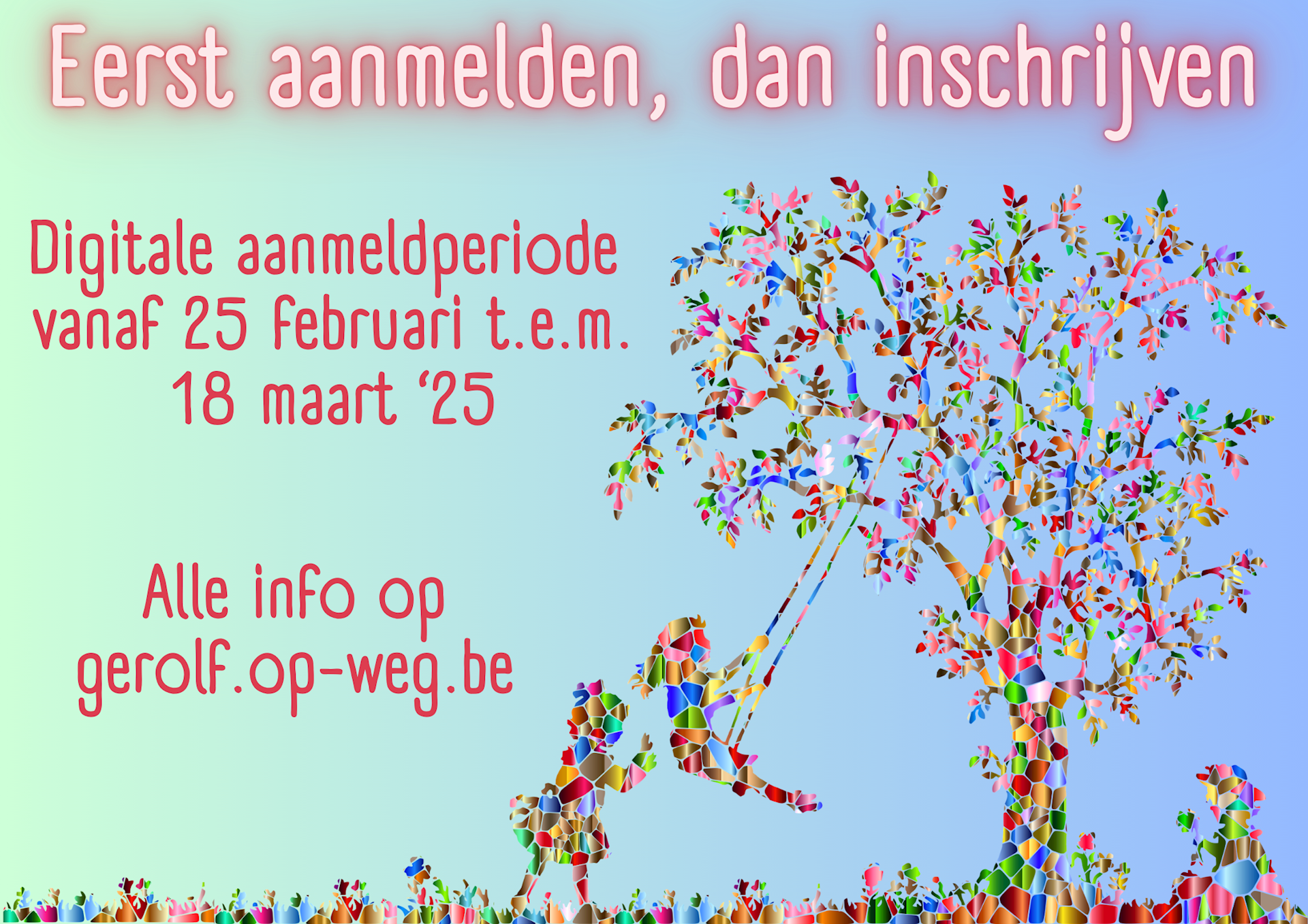 Vanaf dinsdag 25 februari '25 om 9u start de digitale aanmeldperiode voor alle nieuwe leerlingen die zich wensen in te schrijven in onze school. Ook broertjes en zusjes van kinderen die reeds bij ons naar school komen, moeten aangemeld worden. Hiervoor is tijd tot en met 18 maart '25 om 16u. Ga hiervoor naar "praktisch" - "digitaal aanmelden" op onze homepagina.
