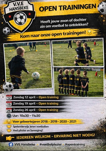 Wij zijn V.V.E Hansbeke en organiseren in april open trainingen voor onze jongste spelers (jongens en meisjes van geboortejaren 2018 t.e.m. 2021).